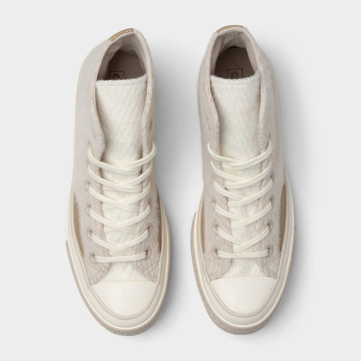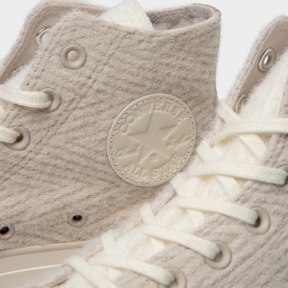- High-top Chucks with fuzzy faux fur upper and leather accents