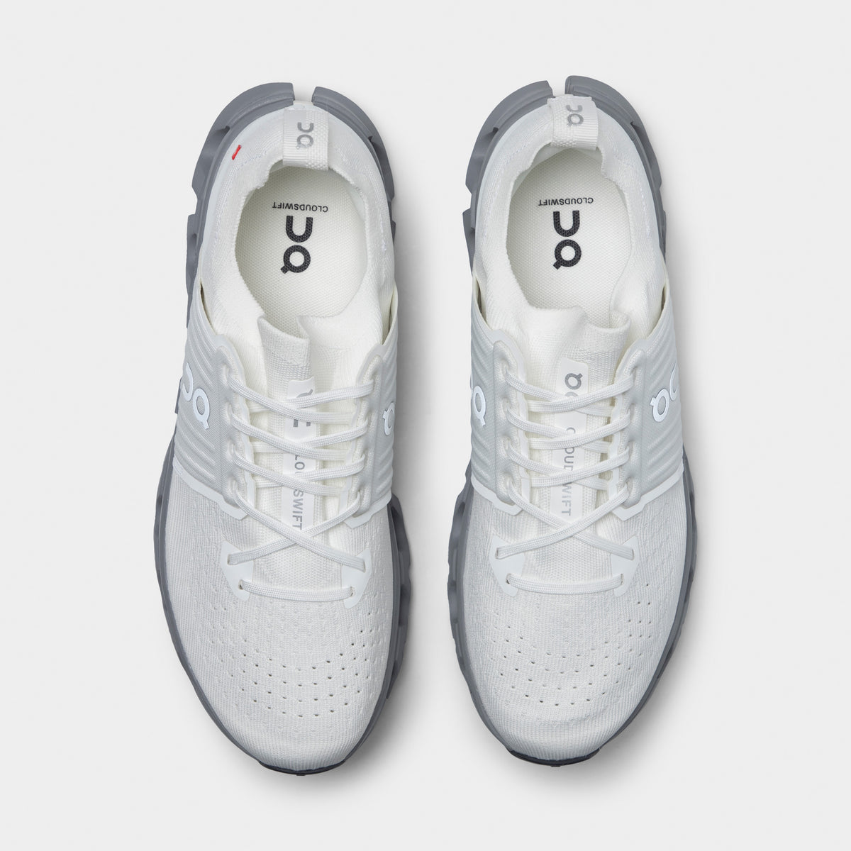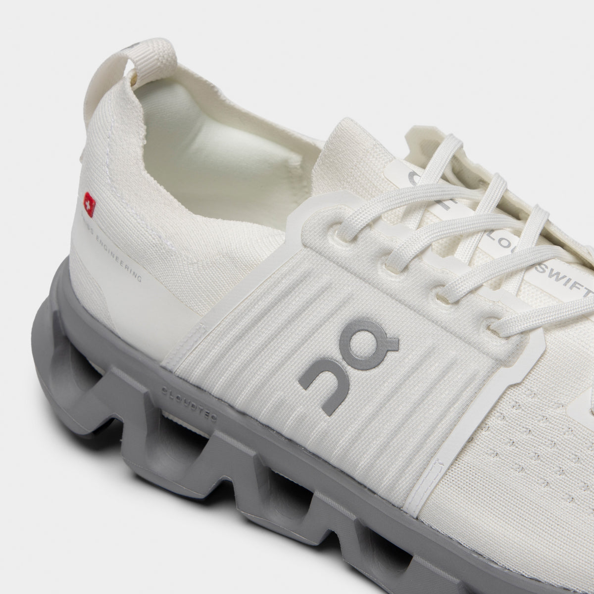The On Cloudswift 4 combines performance and comfort for the ultimate running experience. Featuring a sock-like upper with 3D heel padding, it ensures a snug, secure fit with every stride. The CloudTec® cushioning delivers superior shock absorption, while the wider clouds provide a more responsive, cushioned sensation. The engineered knit upper and Bio Attributed EVA midsole bring a sustainable edge to the design, and the updated outsole offers a more precise, tailored fit. Finished with a nylon blend Speedboard for smoother transitions and added flexibility.