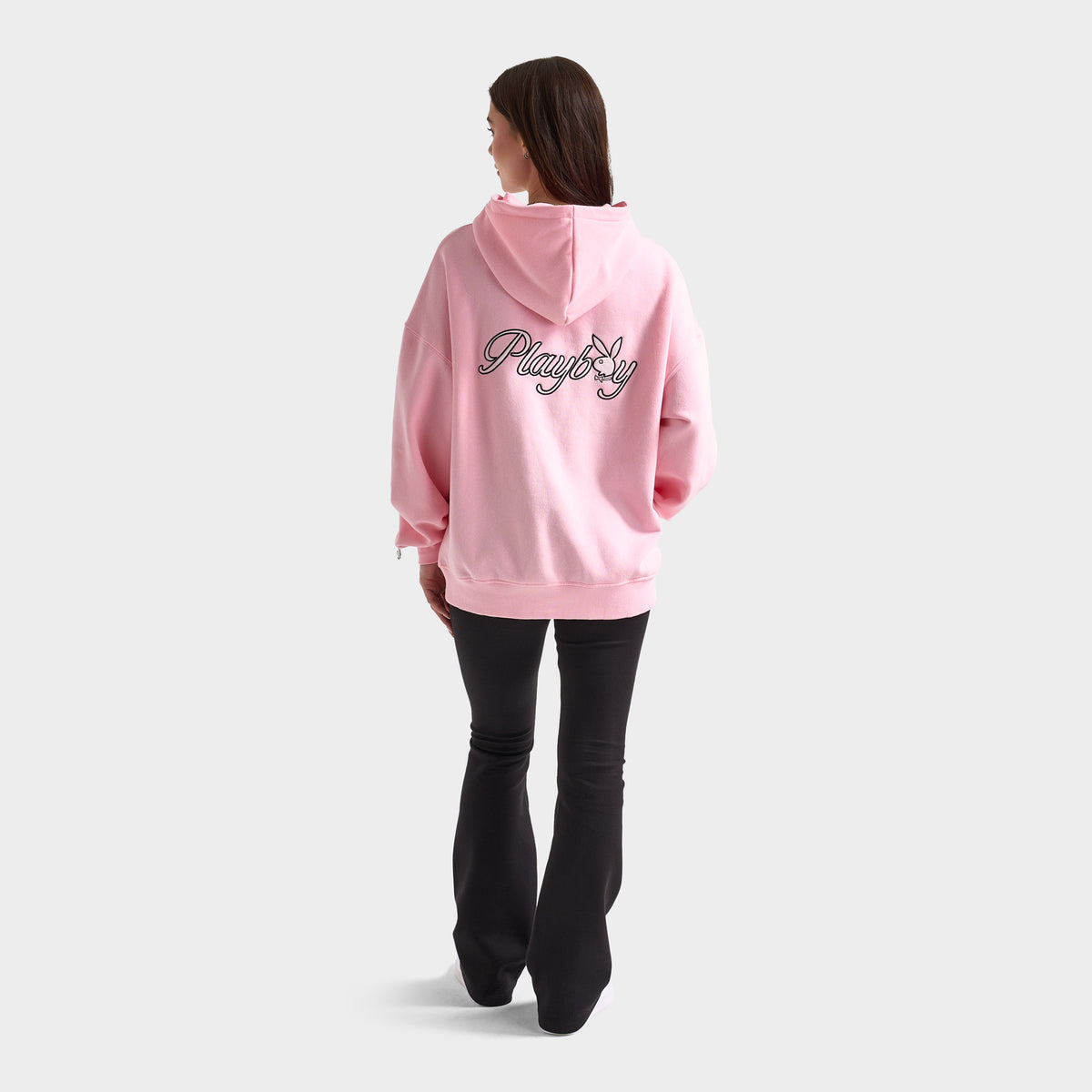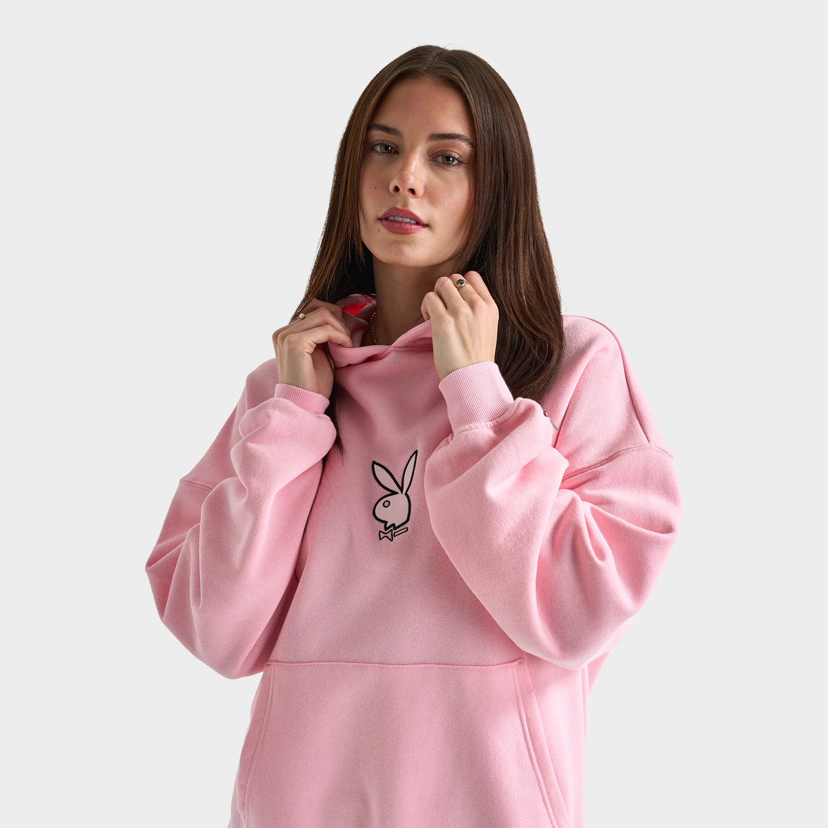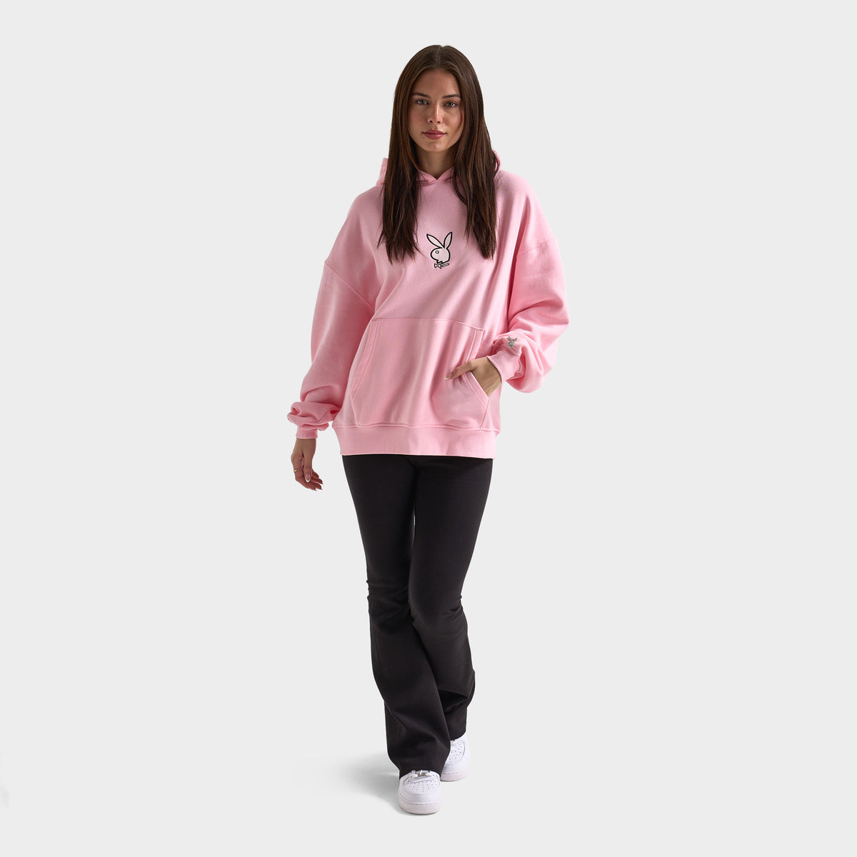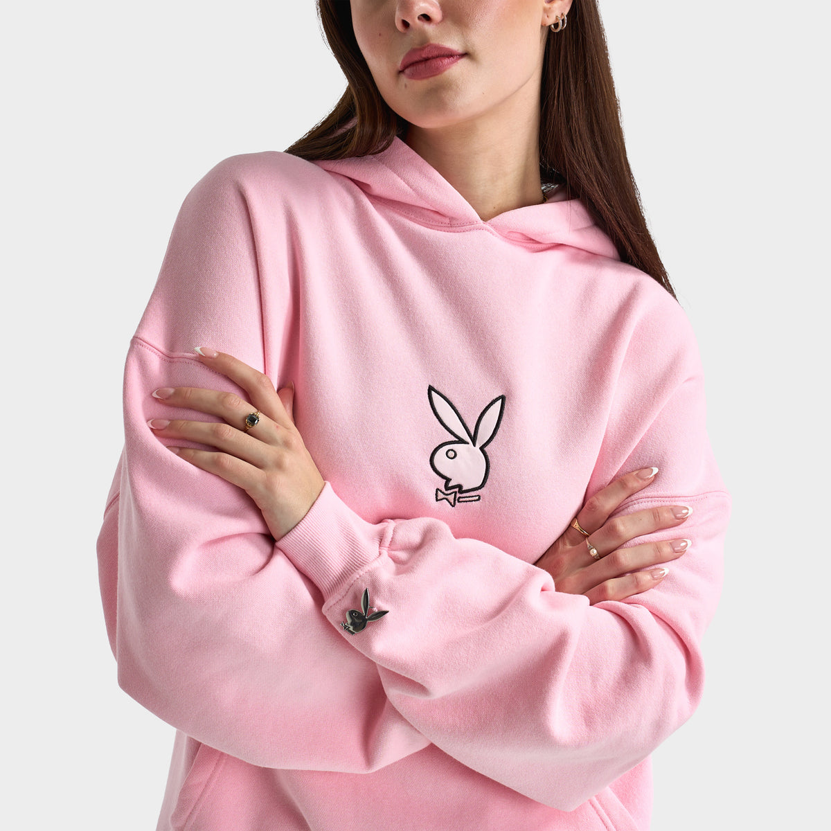 Hit chill mode in the Playboy Script Oversized Graphic Hoodie. With a classic pullover design, hood and kangaroo pocket, this hoodie is the perfect pick for your streetwear collection. Fine details like the satin applique Bunny on chest and metal Bunny badge on the sleeve elevate this staple piece so you can step out in style.