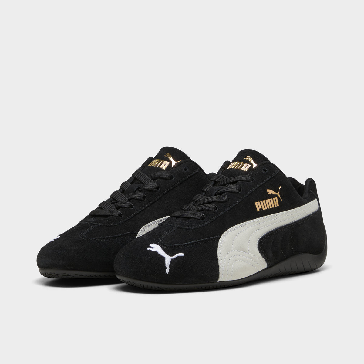 The PUMA Speedcat has been an icon of racing culture for over 25 years, emulating speed, precision and performance. The Speedcat was originally designed as a fireproof Formula 1 style, and over the decades has found its way from the tracks to the streets. Enveloped in a soft suede and premium leather, this silhouette includes the PUMA Cat logo on the toe and is finished with gold foil-style details throughout.