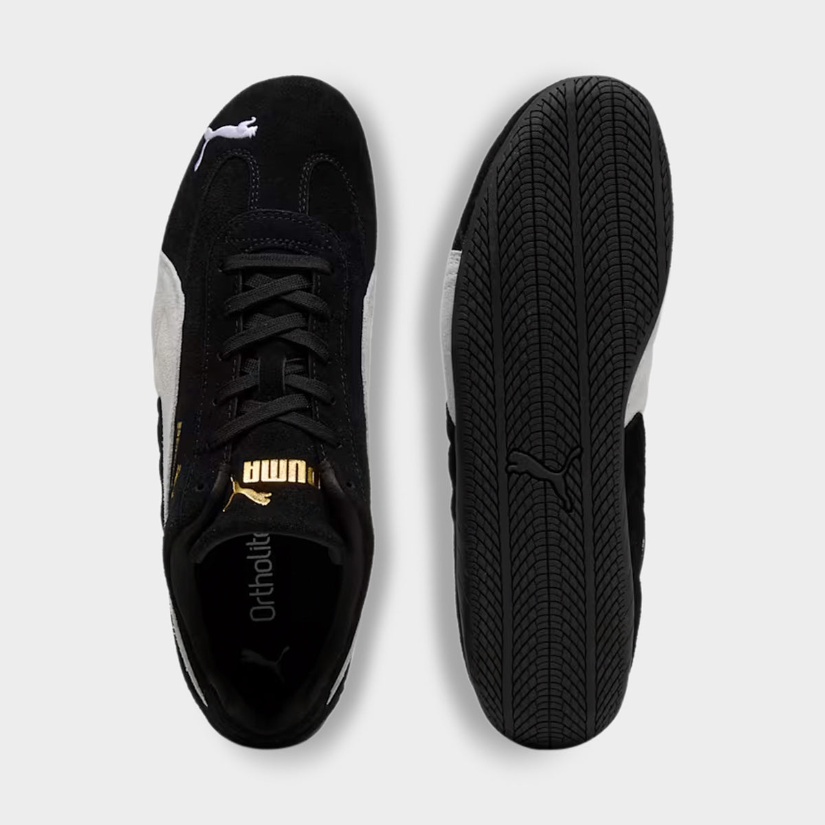 The PUMA Speedcat has been an icon of racing culture for over 25 years, emulating speed, precision and performance. The Speedcat's was originally designed as a fireproof Formula 1 style, and over the decades has found its way from the tracks to the streets. Enveloped in a soft suede, this silhouette includes the PUMA Cat logo on the toe and is finished with gold foil-style details throughout.