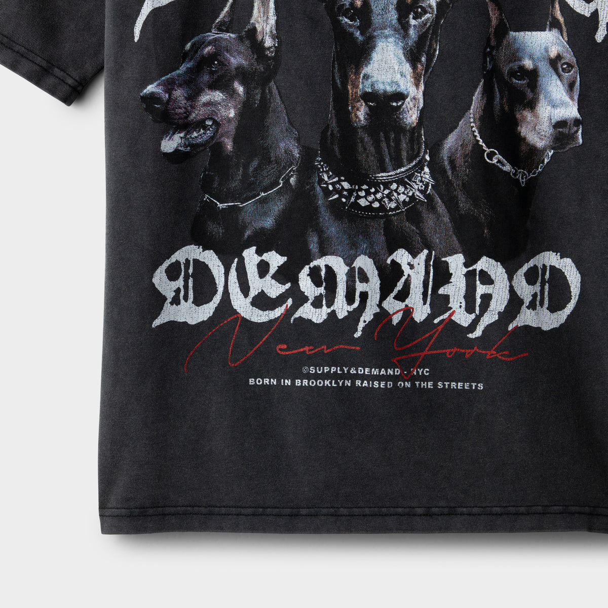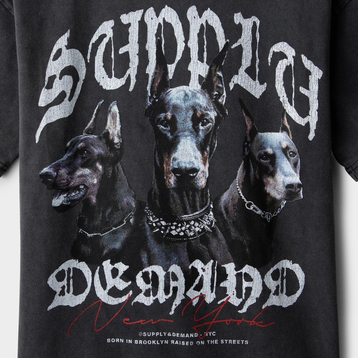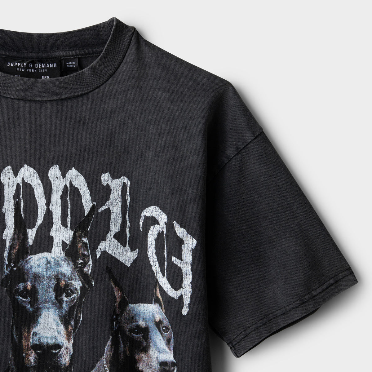 - Large Doberman graphic at the chest