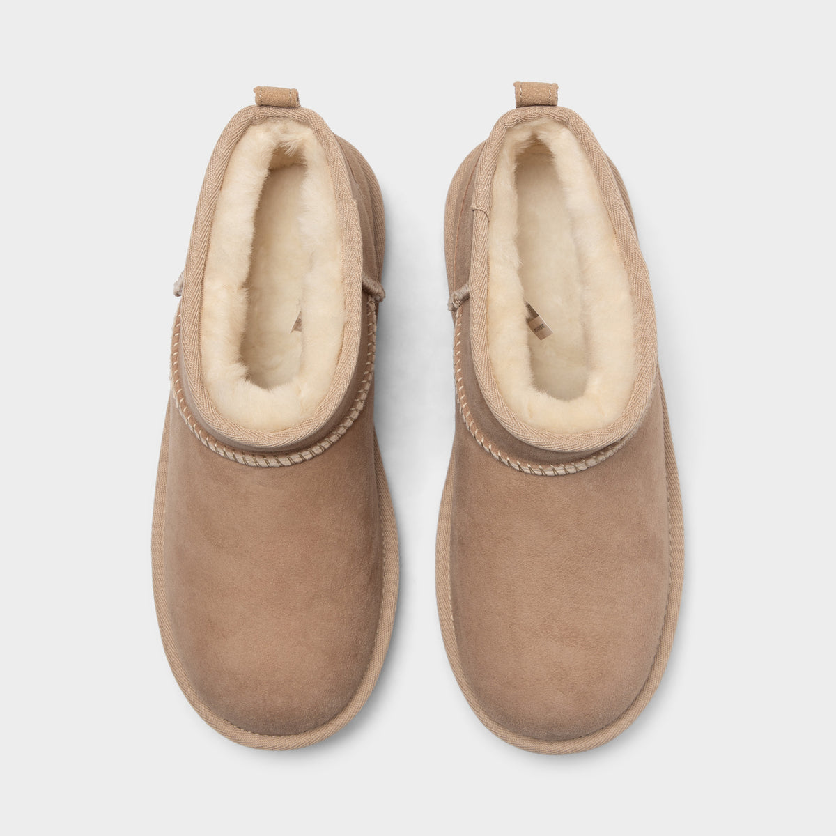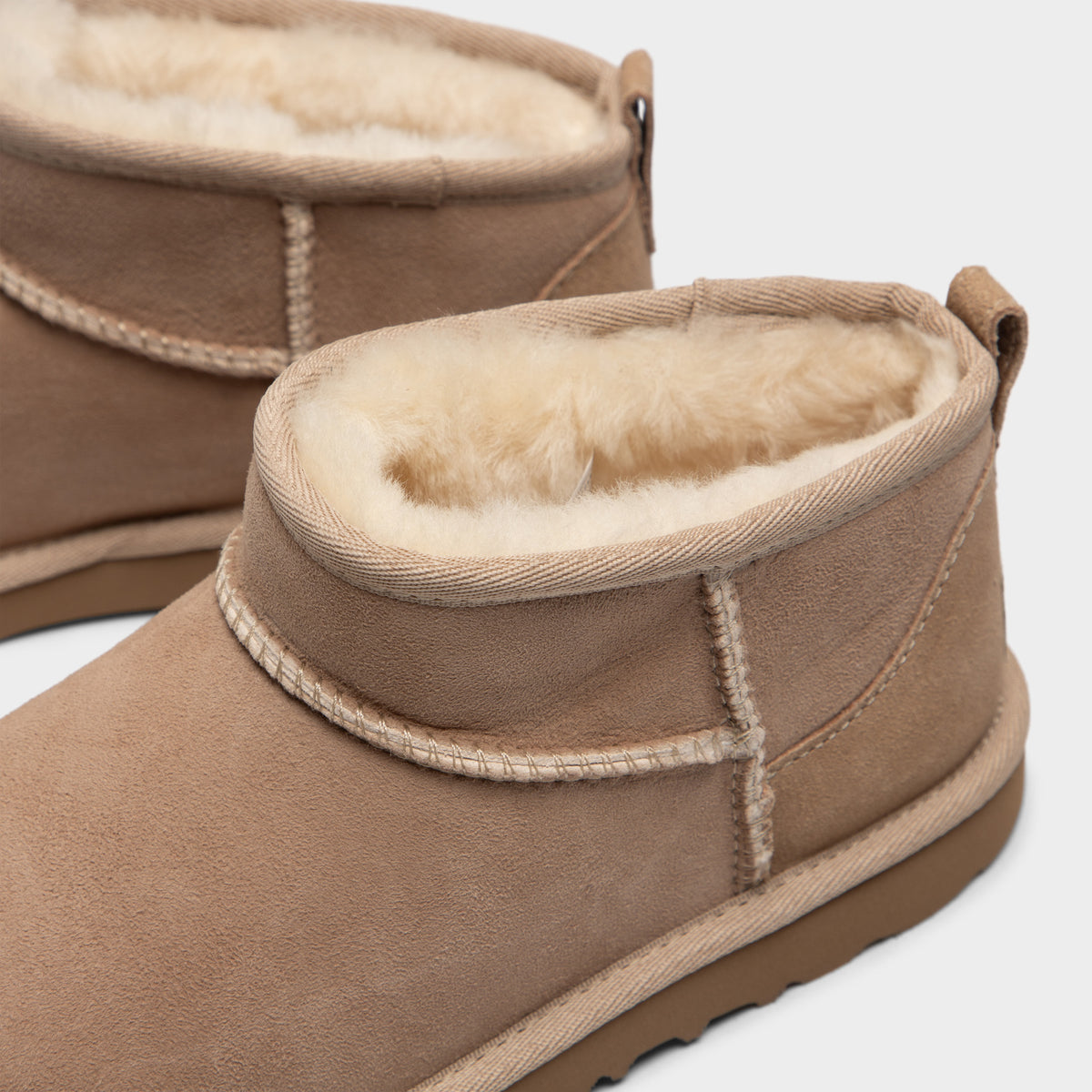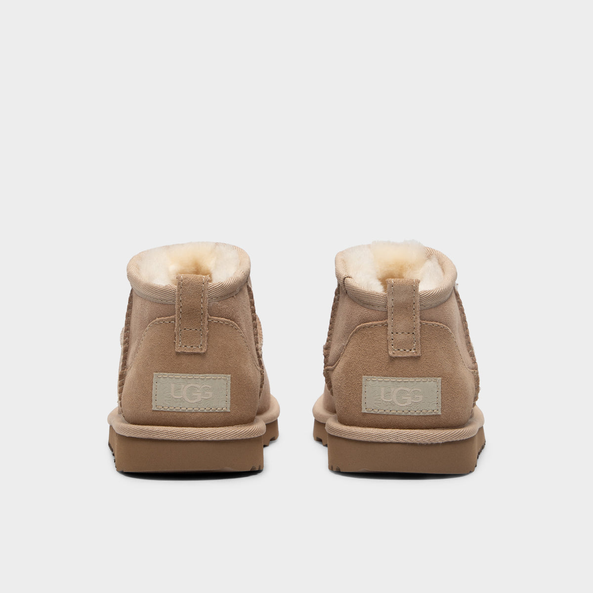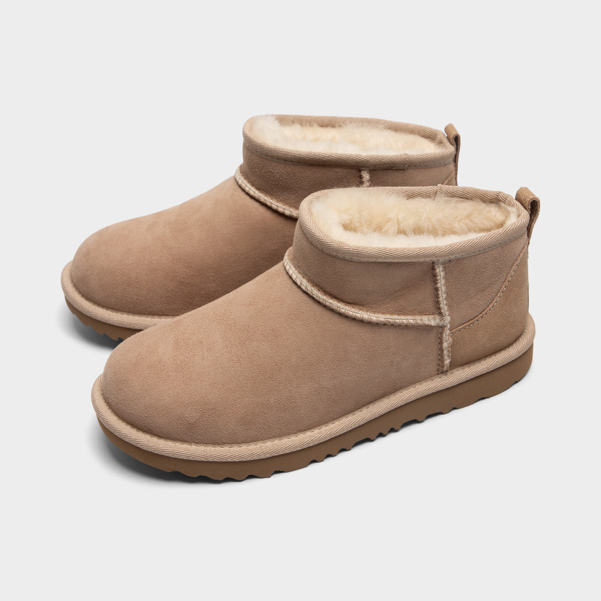 One of the most popular of UGG's classics, the Juniors' Classic Ultra Mini takes your future style icon wherever they need to go in comfort & style. The lower shaft makes this style super easy to pop on and off while the sheepskin lining keeps their feet cozy. This boot is also pre-treated to help it stay looking great for longer, and also has a topically applied water repellent added to keep you dry. Finished off with a lightweight sole, this style is great for everything from post-beach to trips downtown.